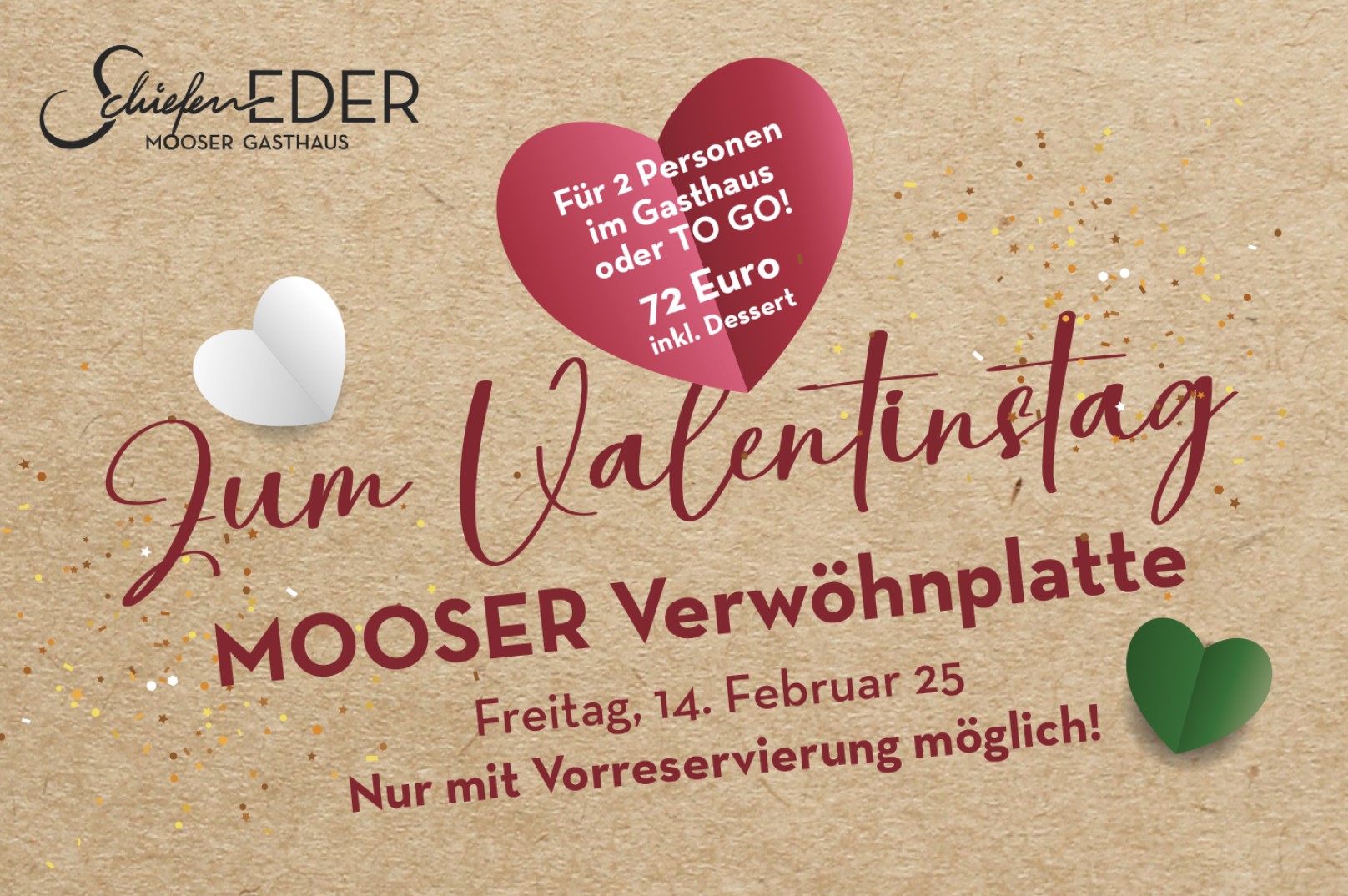 Wir möchten uns ganz herzlich bei all unseren Gästen bedanken, die wir am Valentinstag und in der Verlängerung am Samstagabend bei uns im Gasthaus Schiefeneder bewirten durften. Es war einfach großartig zu sehen, wie ihr den Abend genossen und für so eine tolle Stimmung gesorgt habt!